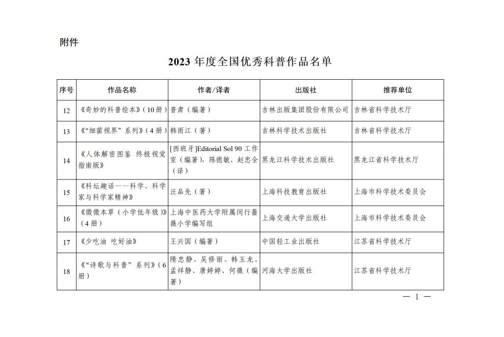 根据《科技部办公厅关于开展2023年全国优秀科普作品推荐工作的通知》(国科办才〔2023〕72号),科技部组织开展了2023年度全国优秀科普作品推荐活动。各地方各部门共推荐475部(套)作品,经形式审查、网络评审和会议评审,评选出2023年全国优秀科普作品100部(套)。其中,91论坛