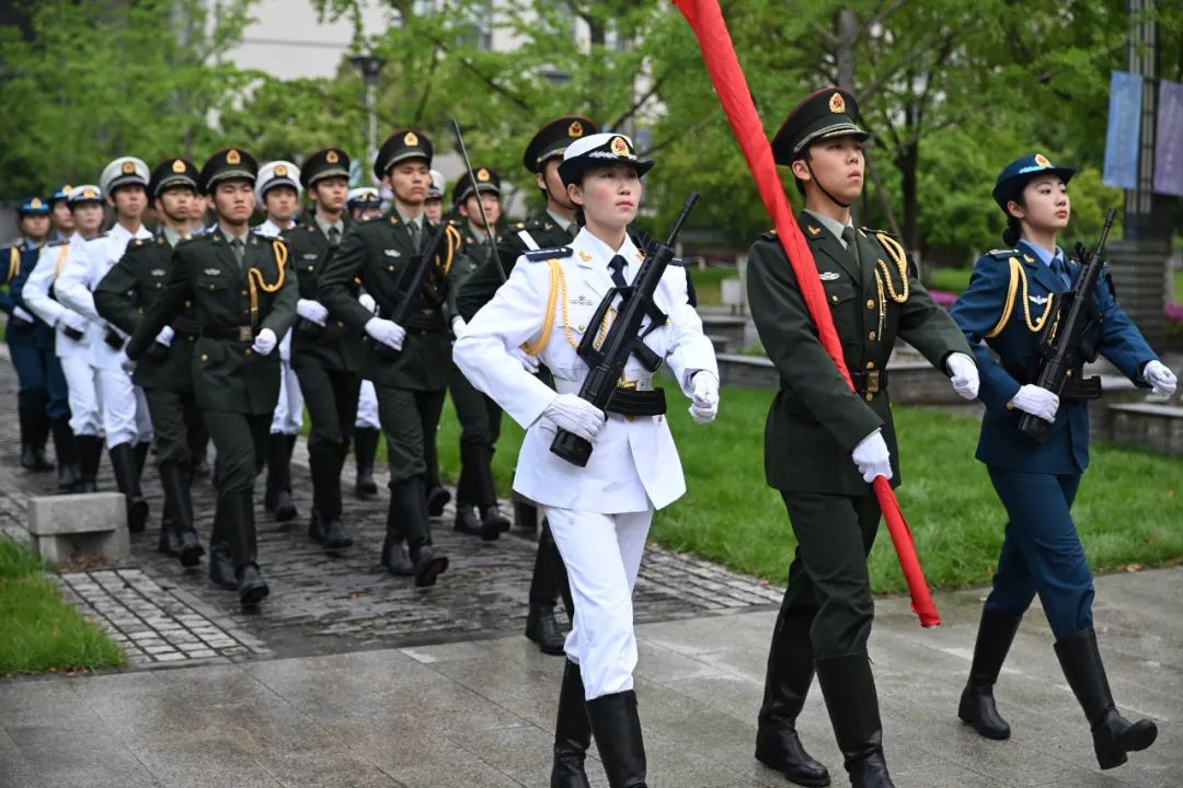 国旗护卫队队员们迈着整齐划一、铿锵有力的步伐,护送五星红旗正步走向旗杆。伴随着激昂的国歌响起,全体师生齐唱国歌,目送五星红旗冉冉升起,在熠熠晨光中迎风飘扬。