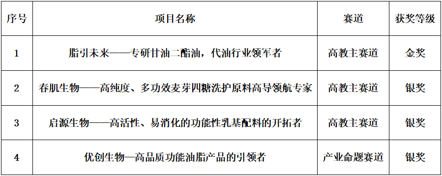 食品学子以优异的表现斩获国赛金奖1项、银奖3项。其中,高教主赛道本科生创意组《脂引未来——专研甘油二酯油,代油行业领军者》荣获金奖;高教主赛道本科生创意组《春肌生物——高纯度、多功效麦芽四糖洗护原料高导领航专家》、高教主赛道研究生创意组《启源生物——高活性、易消化的功能性乳基配料的开拓者》、产业命题赛道产教协同创新组《优创生物—高品质功能油脂产品的引领者》等3个项目荣获银奖。