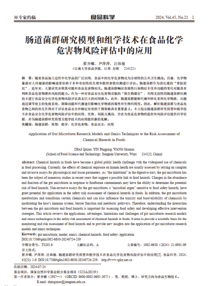 翟齐啸,尹萍萍,汪姝敏.肠道菌群研究模型和组学技术在食品化学危害物风险评估中的应用.食品科学, 2024, 45(21):1-9. //doi.org/10.7506/spkx1002-6630-20240724-239