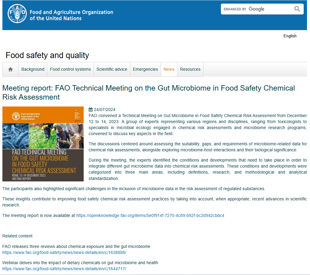 FAO. 2024. FAO technical meeting on the gut microbiome in food safety chemical risk assessment–Rome,12–14 December 2023, meeting report. Food Safety and Quality Series, No. 26. Rome. //doi.org/10.4060/cd1399en