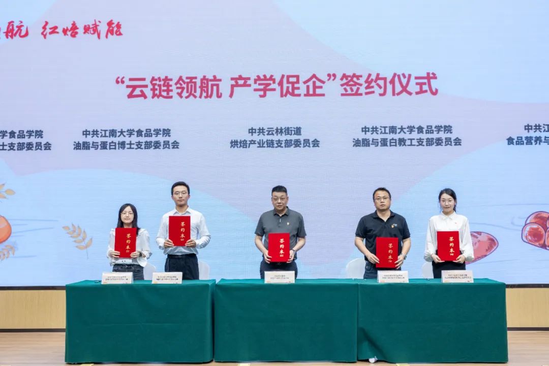 油脂与蛋白教工党支部、油脂与蛋白博士党支部、谷物与淀粉博士党支部以及食品营养与功能博士党支部,与云林街道烘焙产业链党支部、无锡市穆桂英美食广场有限责任公司党支部、区市场监督管理局开发区分局党支部、区委台办党支部、云林街道云津社区党总支、云林V-Park商圈党总支等多个基层党组织签署结对共建协议。通过这一合作,各方将进一步整合优质资源,加强在烘焙领域的产学研交流,深化校地企合作,共同推动食品产业向着更高水平进发。