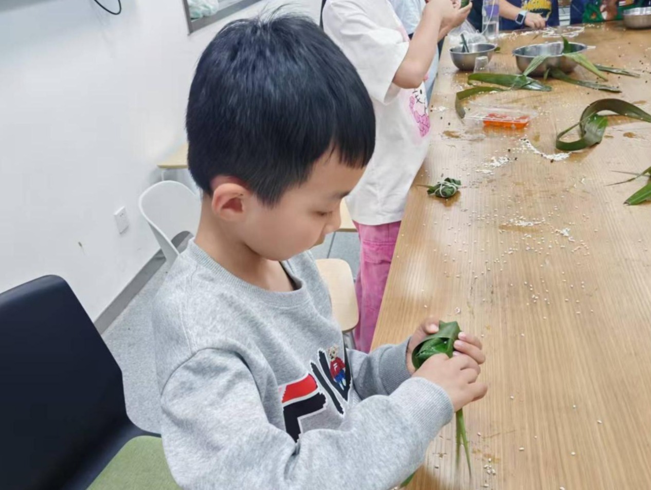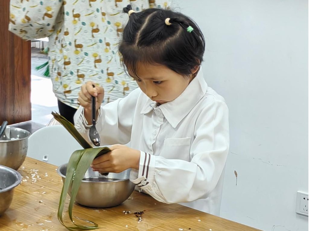 随后,备受期待的包粽子环节将现场气氛推向高潮。长桌上粽叶青翠堆叠,糯米、红豆、蜜枣、蛋黄等馅料琳琅满目。助教老师指尖翻飞,折叶成斗、填料压实、包裹成形、棉线缠绕——一个棱角分明的粽子诞生。“江小娃”们纷纷化身“包粽小当家”。尽管粽叶“调皮”、糯米“逃窜”,但在助教们手把手的耐心指导下,孩子们渐入佳境,甚至玩起了“创意粽”——改良外形、混搭馅料,童趣与智慧齐飞。现场粽叶沙沙,笑语盈盈,温馨满溢。