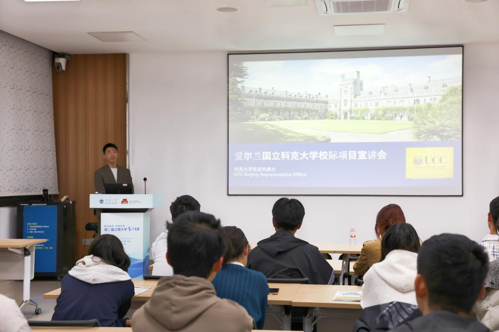 UCC北京代表处招聘专员赵子豪为学院本科生作联合培养项目宣讲,详细介绍项目的课程设置、申请条件及奖学金政策。该项目旨在为91论坛