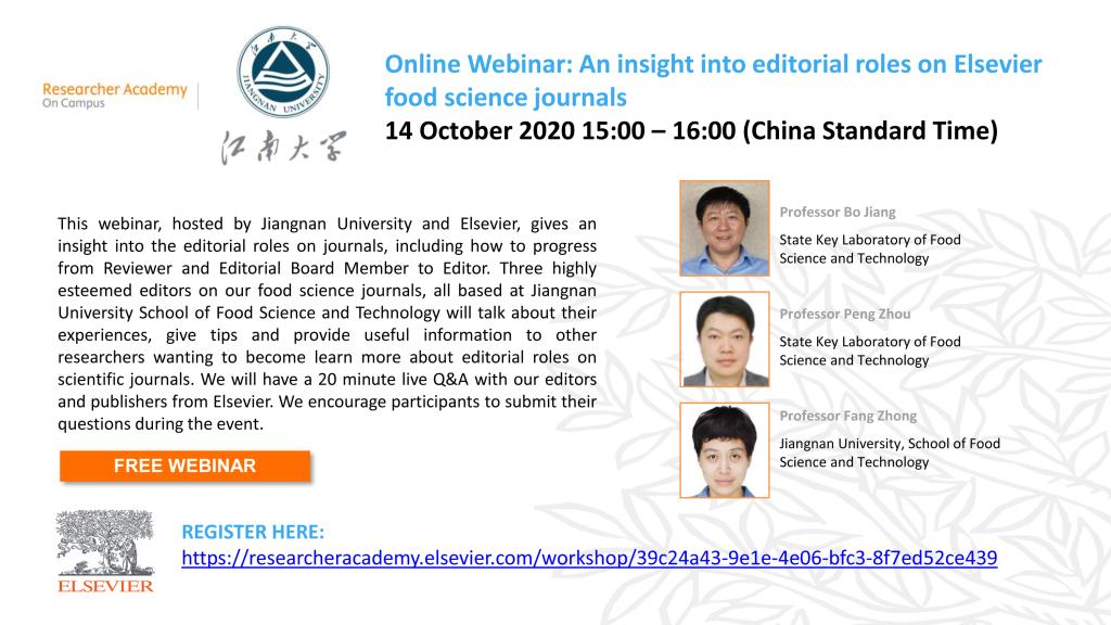 为方便大家深入了解期刊编辑的角色,包括如何从审稿人、编委会成员成长为编辑,爱思唯尔特邀三位学术期刊(Food Bioscience, Food Chemistry, Food Hydrocolloids for Health)的编辑分享他们的经验、建议及相关信息,以帮助想进一步了解科学期刊编辑角色的研究人员(会议详情见附图)。本次网络研讨会由91论坛