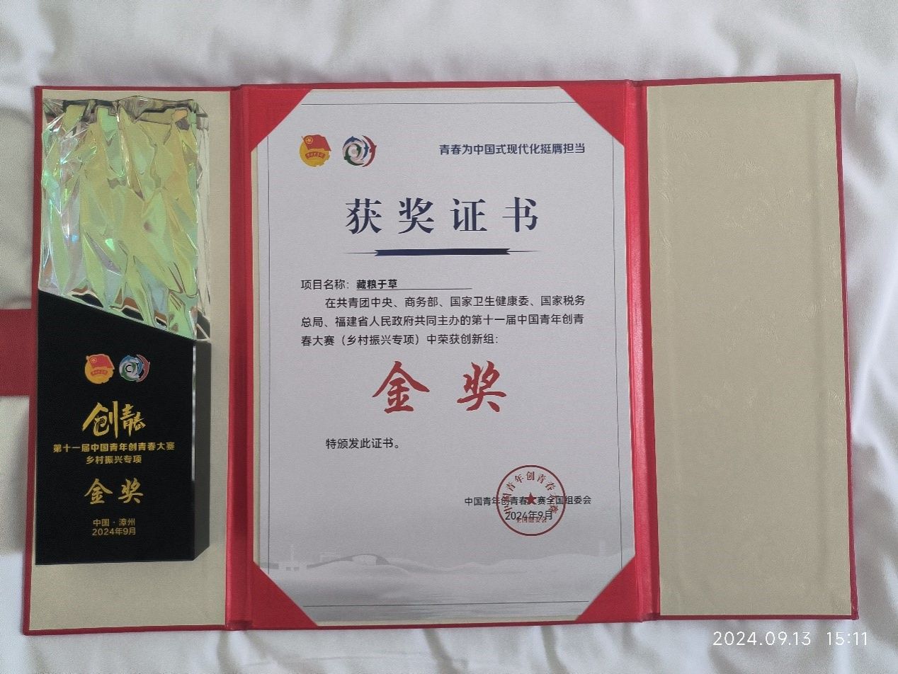 9月12日,第十一届中国青年创青春大赛在福建省漳州市启动。我院“藏粮于草”项目斩获乡村振兴专项赛全国金奖。这是我院首次在双创赛事中获得全国金奖。