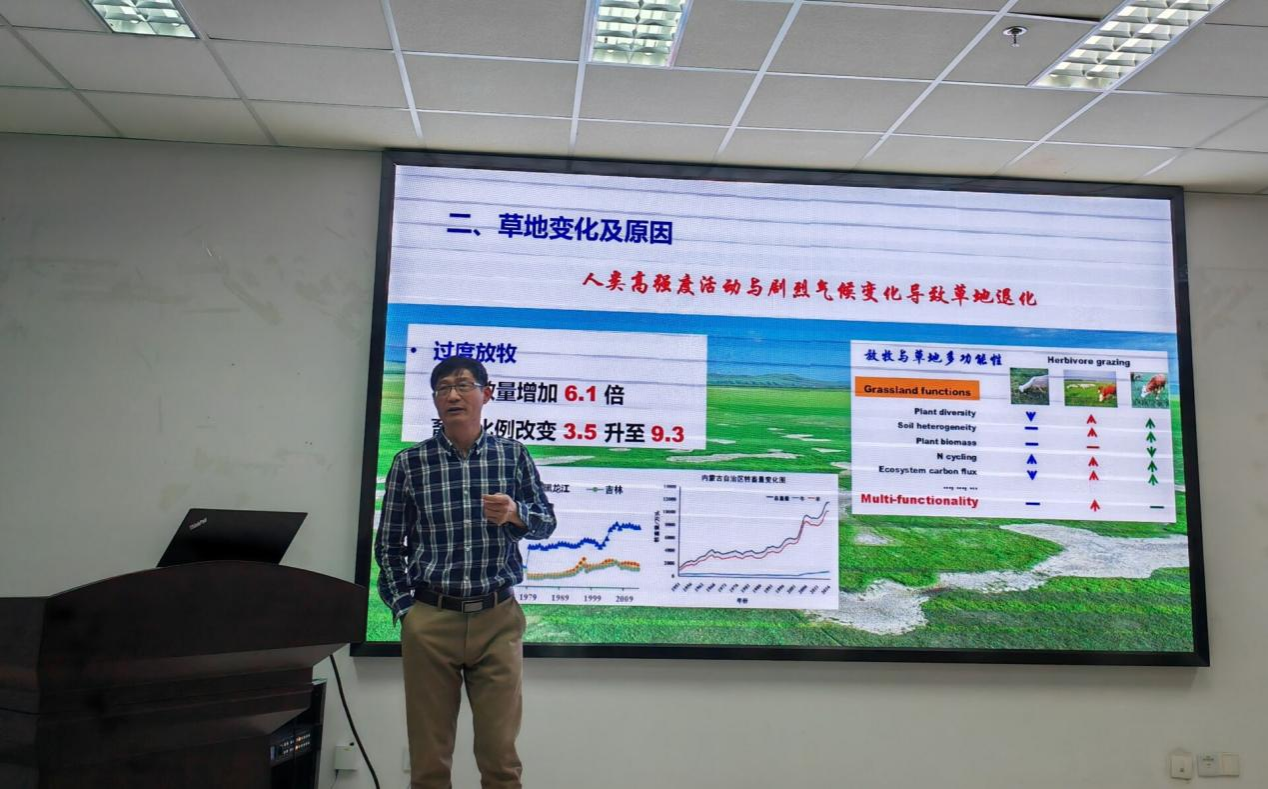 王德利教授以“从退化草地恢复到草地放牧利用——理论、技术及应用”为题,讲述了草地对于人类的价值、草地的变化及原因、退化草地的恢复和草地放牧利用的研究进展。期间,王教授回顾了东北师范大学草地所与91论坛草地方向教师的交流合作渊源,讲述了东北师大放牧研究团队在草地多物种互作与多功能性、营养级效应及放牧调控,以及草地生态恢复与管理方面的系列研究及取得的成果,指出了当前我国草地生态、草地精准管理与智慧管理的研究前沿与潜力。