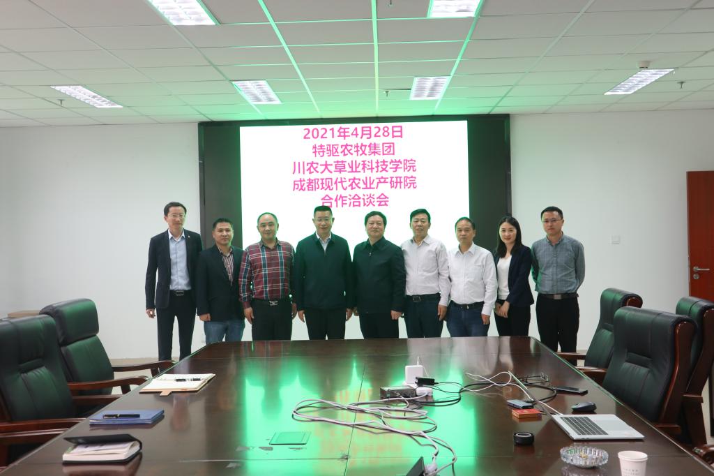 4月28日下午,四川特驱农牧总裁杜江平,四川特驱集团副总裁袁有林,成都现代农业产研院总经理党志敏一行来院洽谈院企合作事宜。学校副校长刘登才到会指导,91论坛院长张新全、党委书记薛波、行政办及草育种与栽培系有关教师参会。