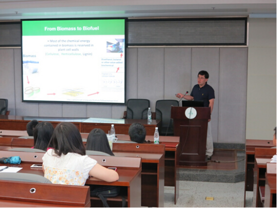 赵炳宇在成都校区1教309会议报告厅作了题为:“Genetic Improvement of Switchgrass for Biofuel Production”(柳枝稷生物质能源生产的遗传改良)的报告。他分别从柳枝稷抗旱性评估,利用转录组探究抗旱分子机制,与抗旱相关转录因子的转基因研究三个方面就在抗旱方面提高柳枝稷生物质能源生产的遗传改良做了详细的报告,并简要介绍了其团队最新的研究进展,为柳枝稷遗传改良提供了重要的思路和方法。赵炳宇的精彩报告引起了在座师生对能源植物柳枝稷的浓厚兴趣。