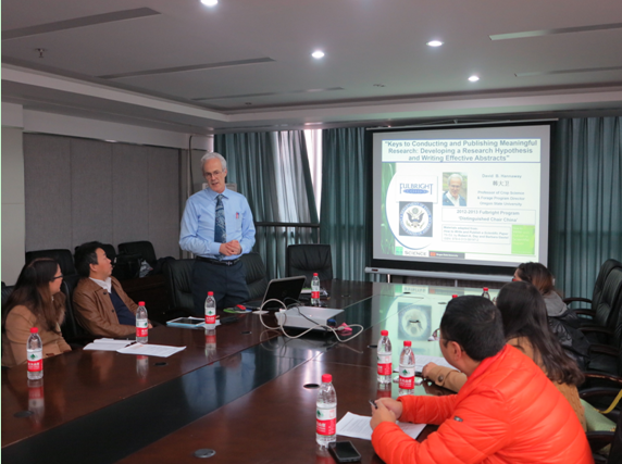 David教授做了题为“Keys to Conducting and Publishing Meaningful Research: Hypothesis Development and Writing Effective Abstracts”的报告,向在座研究生同学们介绍了论文写作的方法,提出研究假设的重要性。他强调,研究假设都可以用“if…then…”来描述,并利用正在撰写的手稿为例,教大家如何撰写论文题目和摘要部分。另外,David还提醒大家,在准备实验的同时就要开始论文写作,而不是等到实验完成才开始着手撰写论文,论文引用的参考文献也应该是自己已经阅读过的文献,而不该引用未读过的文献。报告完后,David为研究生同学的论文写作解疑答惑,在与同学们的交流中,提高了同学们对论文写作的认识。